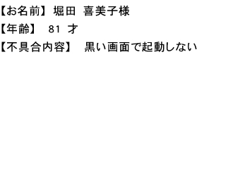 電機店に持っていくとSONYはPCへ事業を撤退し処分しか無いと言われ落胆しましたがお世話になっている青葉PC横丁からPCクリニックを紹介してもらいへ持ち込んだところ 修理して頂けて、とても嬉しいです。 また、お店の雰囲気もよく、また何かあればお願いしたいです。